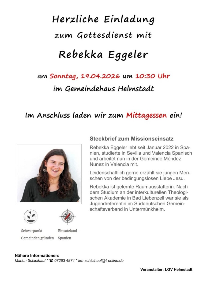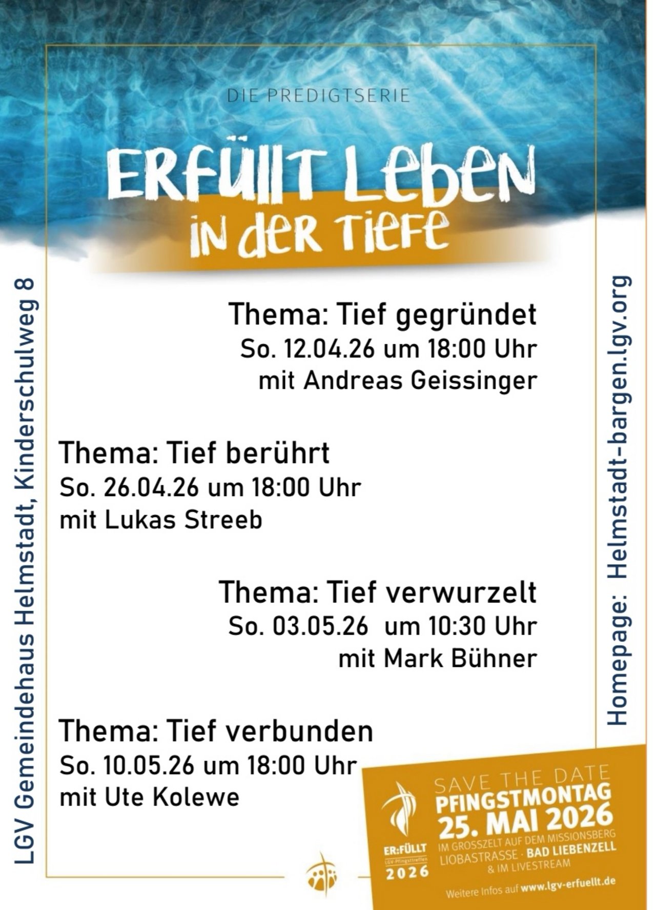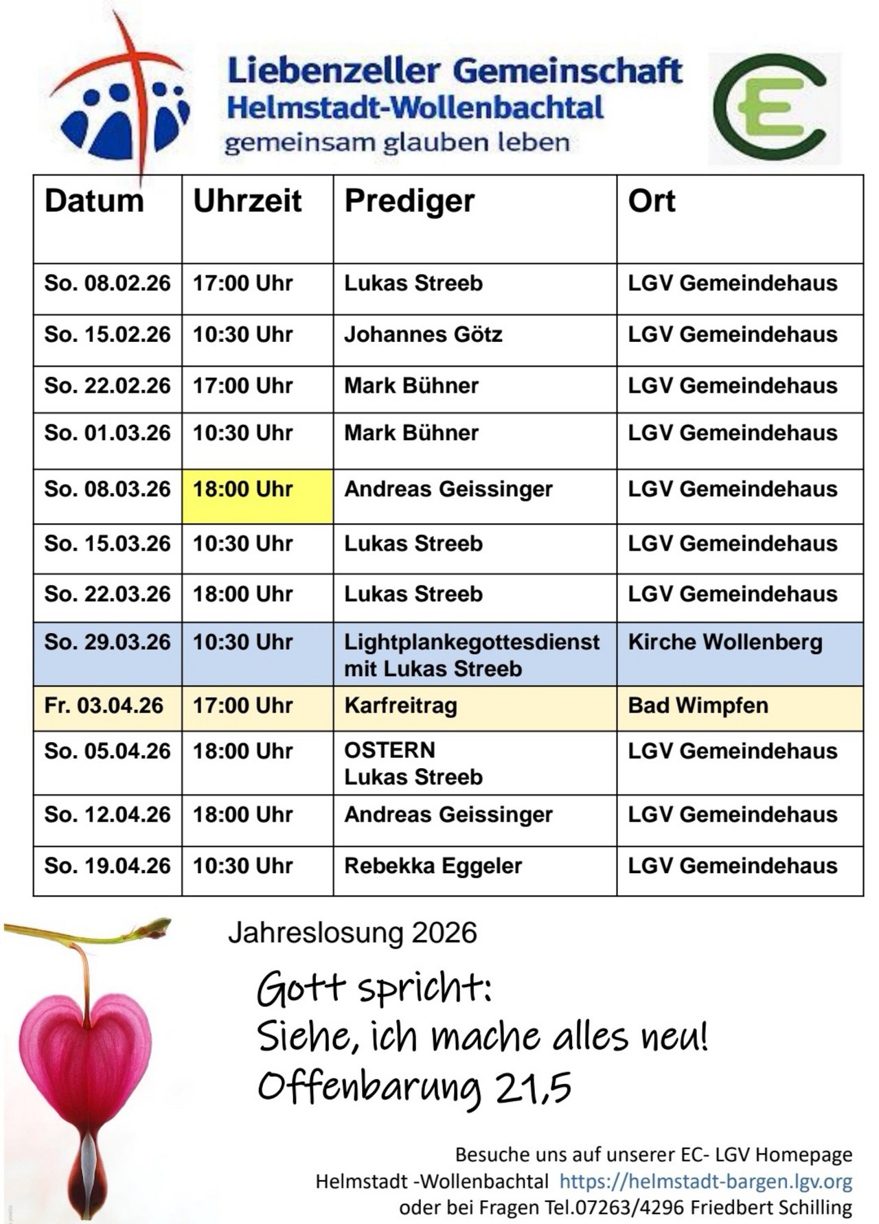So gut wie jeden Sonntag bietet die Liebenzeller Gemeinschaft Helmstadt ein Gottesdienst um 18 Uhr im LGV Gemeinschaftshaus (ehemaliges evangelischen Gemeindehaus) Helmstadt an.